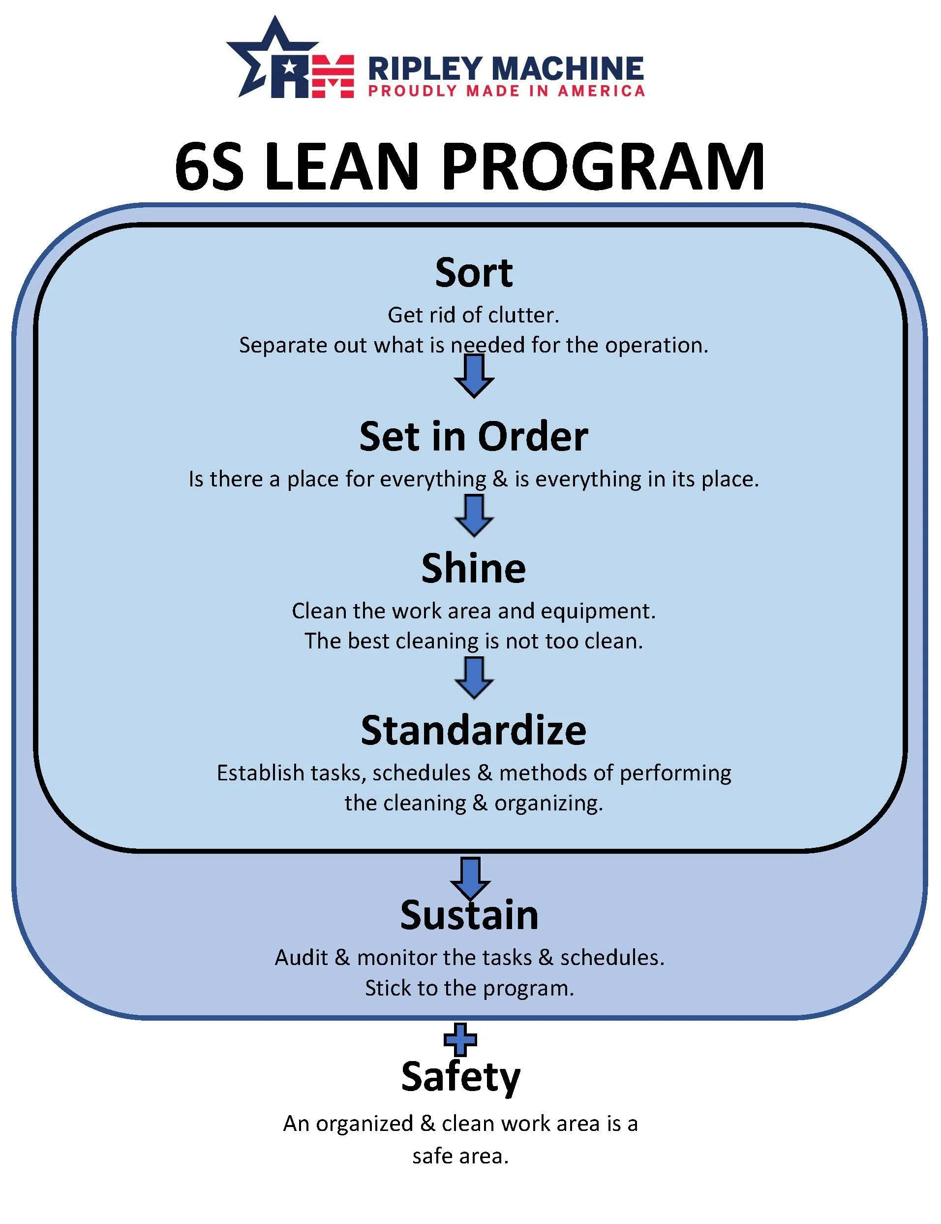 *Author’s note: Ripley Machine puts the highest regard for safety. To ensure a focus on safety, we have adopted the “6S Lean” focus where we add “safety” as the sixth pillar of lean. For this blog, we used the more commonly known “5S”.