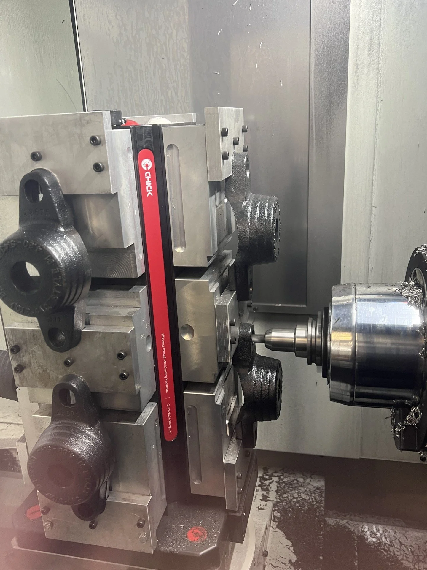 With the new equipment, we were able to process the entire part in one operation. We modified Chick Workholding tombstone vices to be able to hold several parts at once and reach all sides of the part. The machine time was greatly reduced and with pallet changing, all handling of the part is done while the machine is running. We were able to work with our customer to reduce the cost of the part by 40% despite recent material increases.