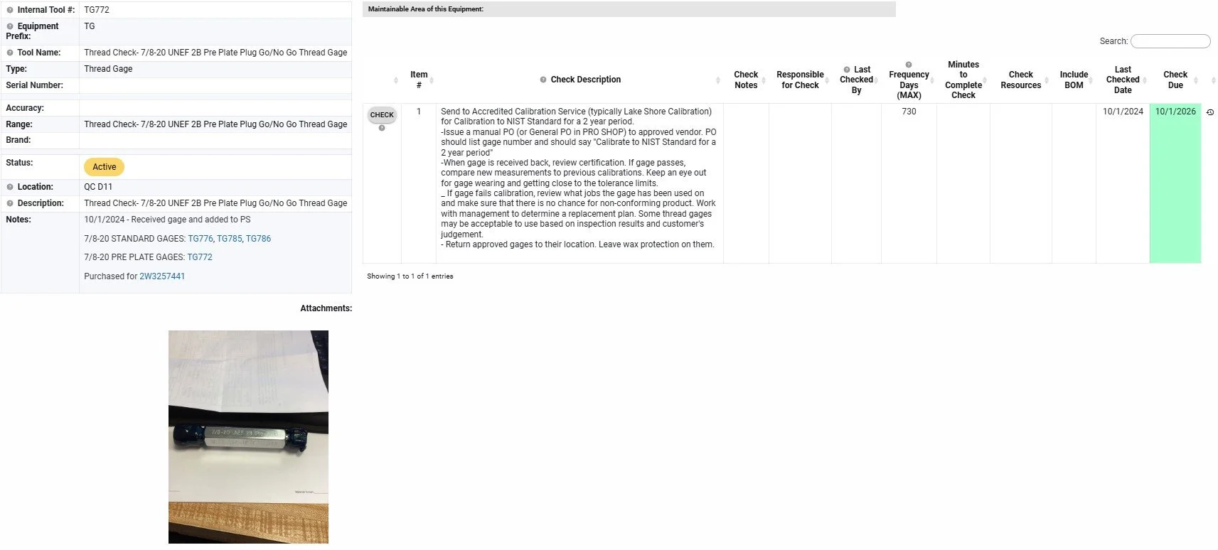 Each gage in our quality management system has its own page inside of our ERP. We are able to setup checks to ensure gage is calibrated in a timely manner. On the left side you will see information pertaining to this gage. As you can see, this gage is linked to similar gages as well as the part(s) this gage is used for.