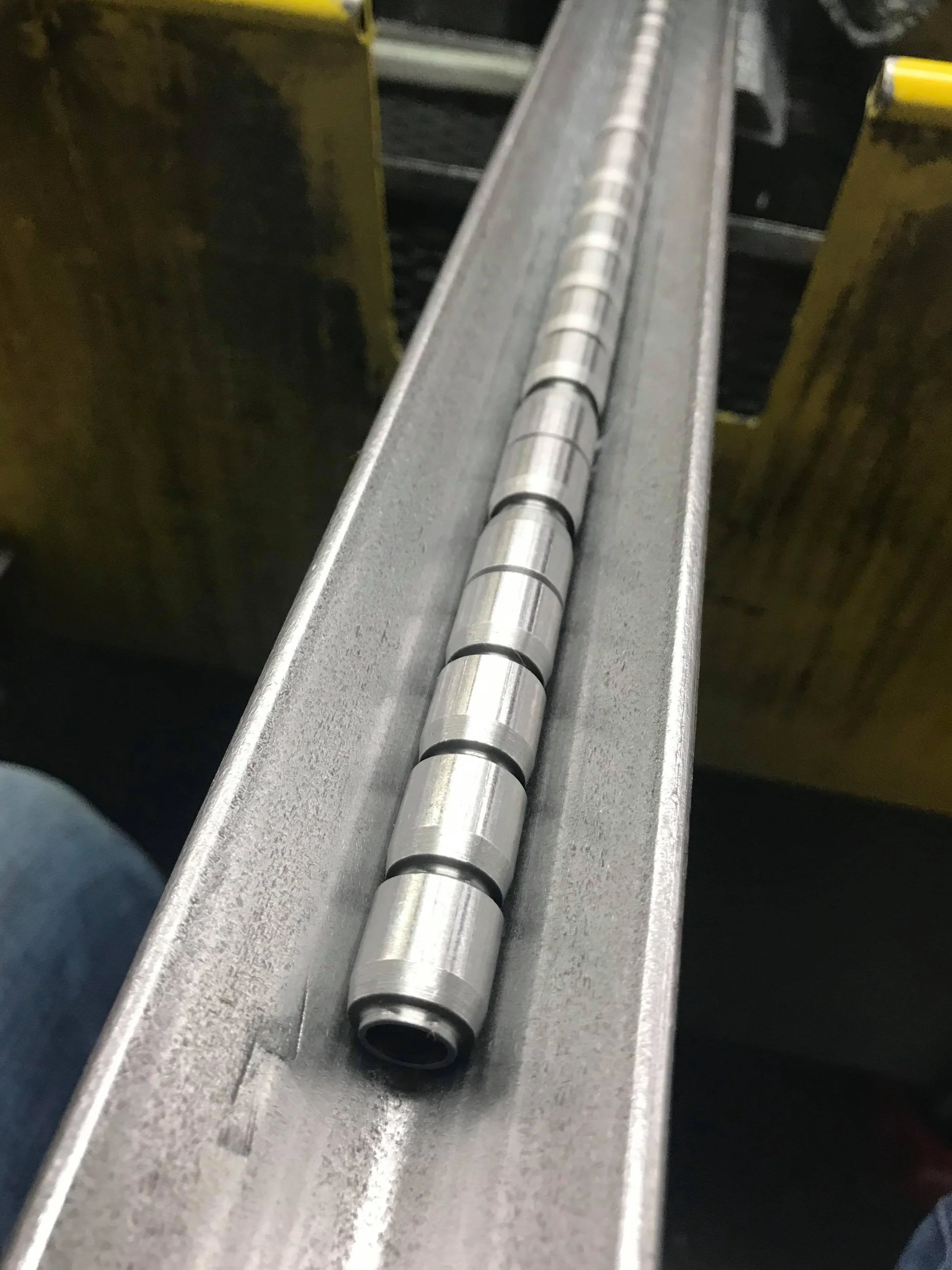 The picture on the left shows an example of a typical thrufeed centerless grinding job. As you can see, the bushings are sent through the grinder one after another. An operator on the other side of the machine sizes the parts utilizing micrometers, air gages, or other similar measuring equipment.
