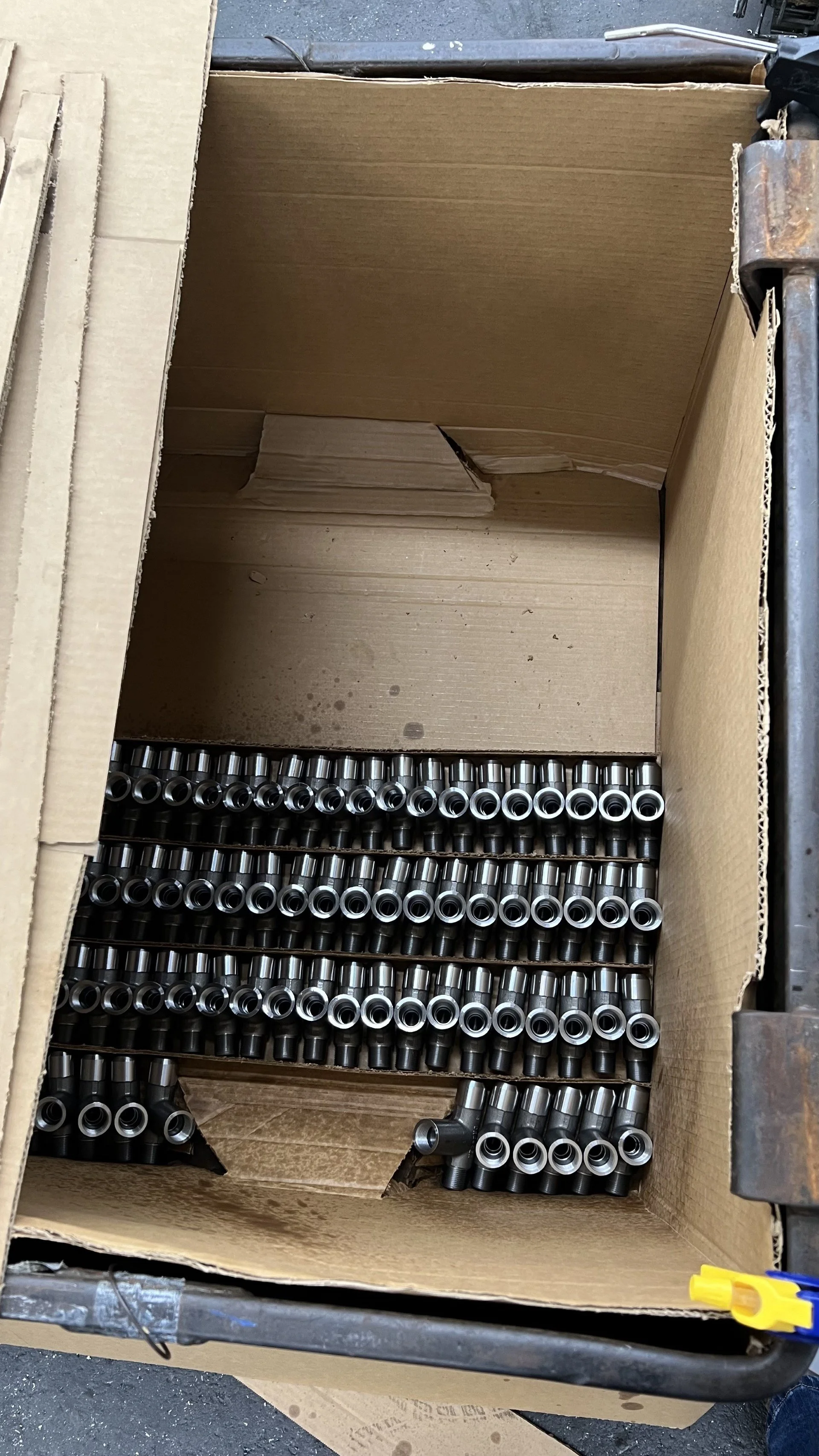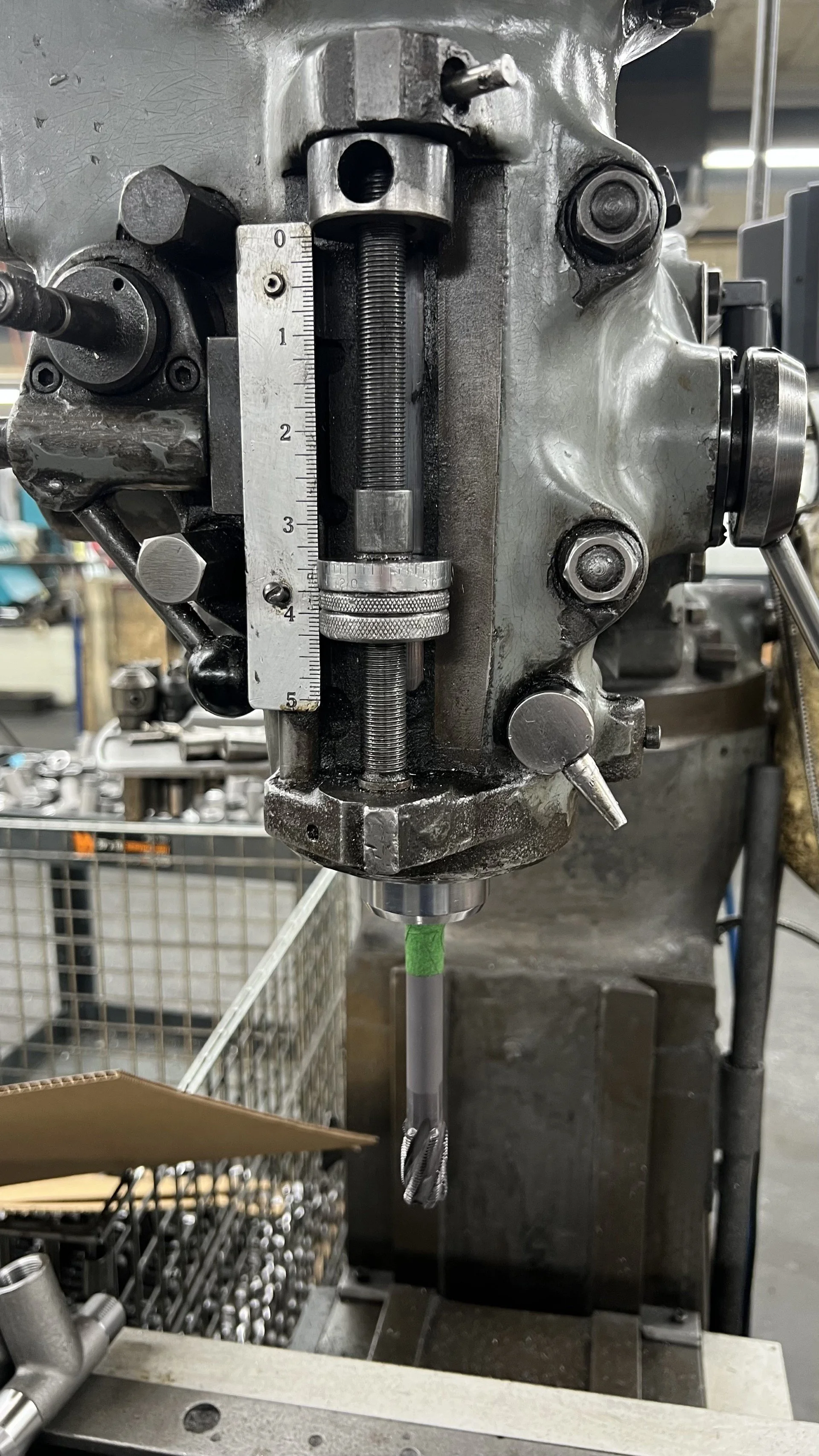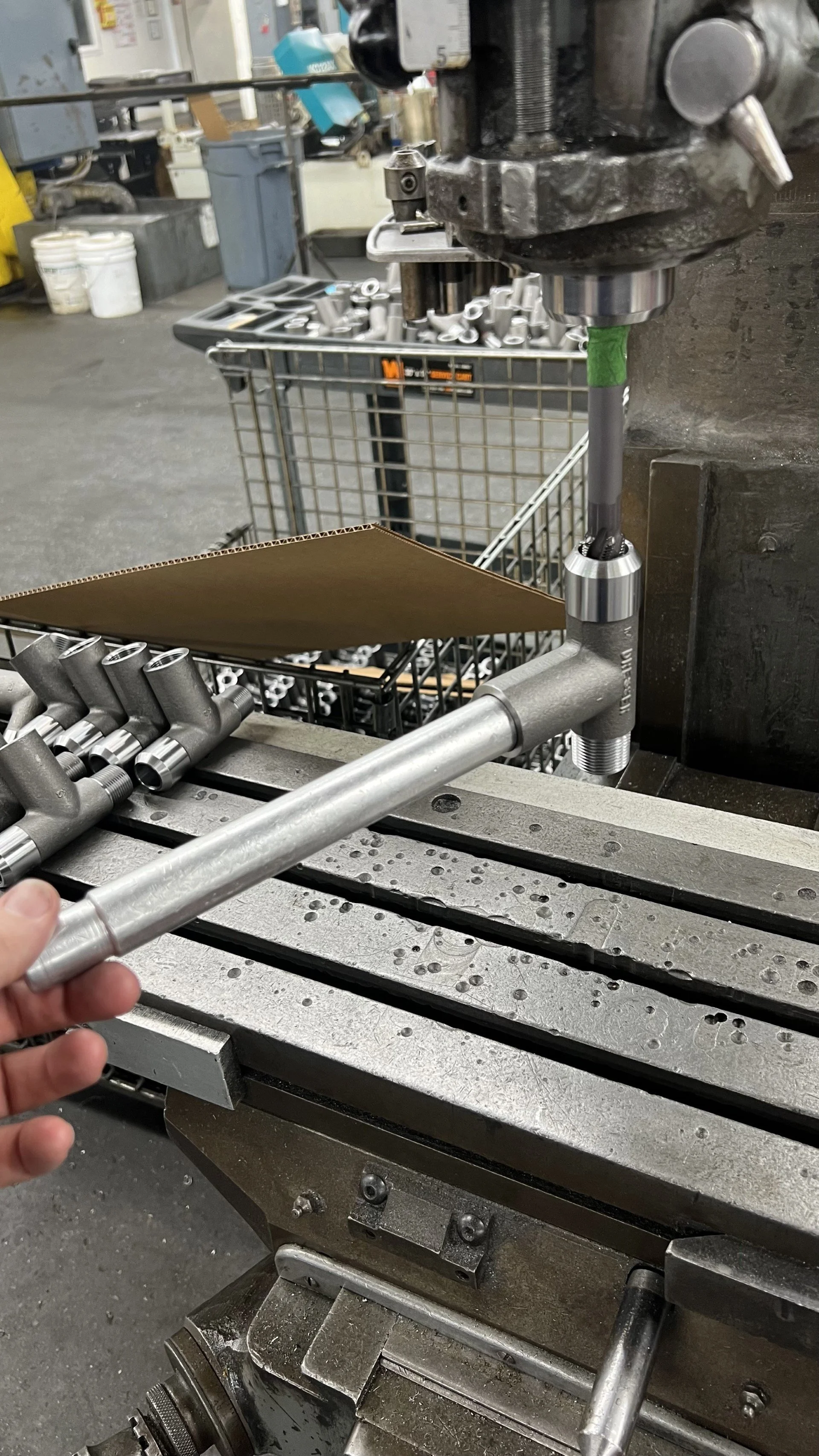 Once an hour, thread gage in past the .590” hole (from the 3/4” NPT end). This will ensure that you are breaking the bur on 3/4” NPT end as well as ensuring to remove any bur from where the .590” Hole breaks into thread.