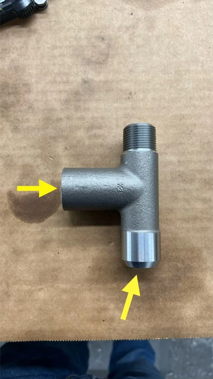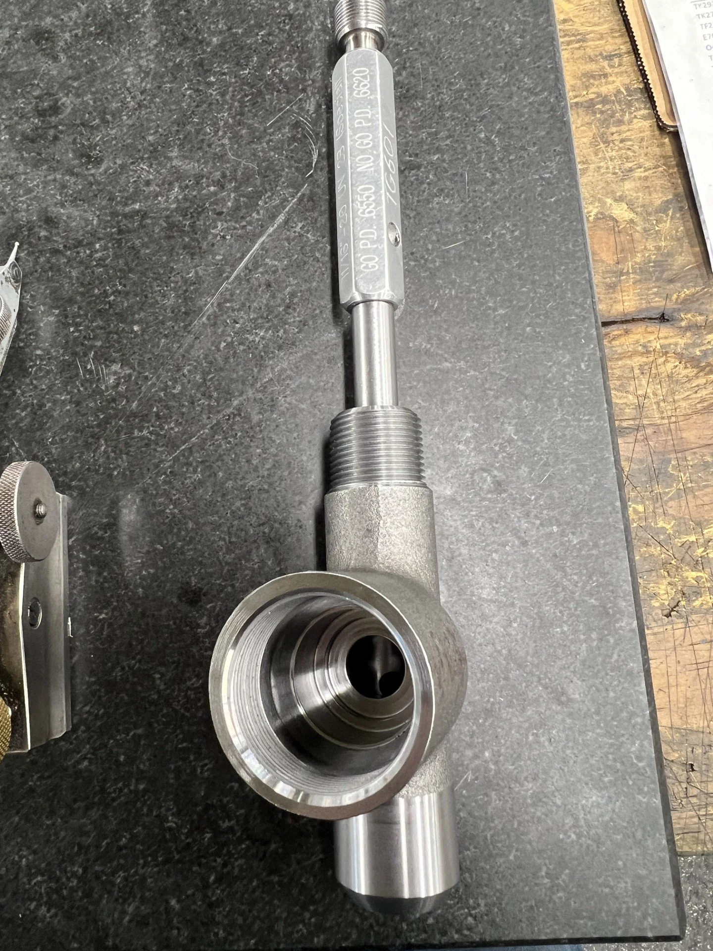 At the start and end of each shift, make sure that you thread the thread gage the ENTIRE way through the part (as shown in picture). A tool (second picture) passes through the part to create a surface for welding. So, by threading the gage the entire way through the part, you ensure that part will function as desired.